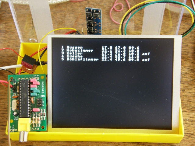 Das Display1 "5,6" (14,22 cm) Display-Set JD567M03/AT056TN52, VGA/CVBS": Temperatur- und Luftfeuchtigkeitsdaten. Ansteuerung über das rs232 nach Video Modul